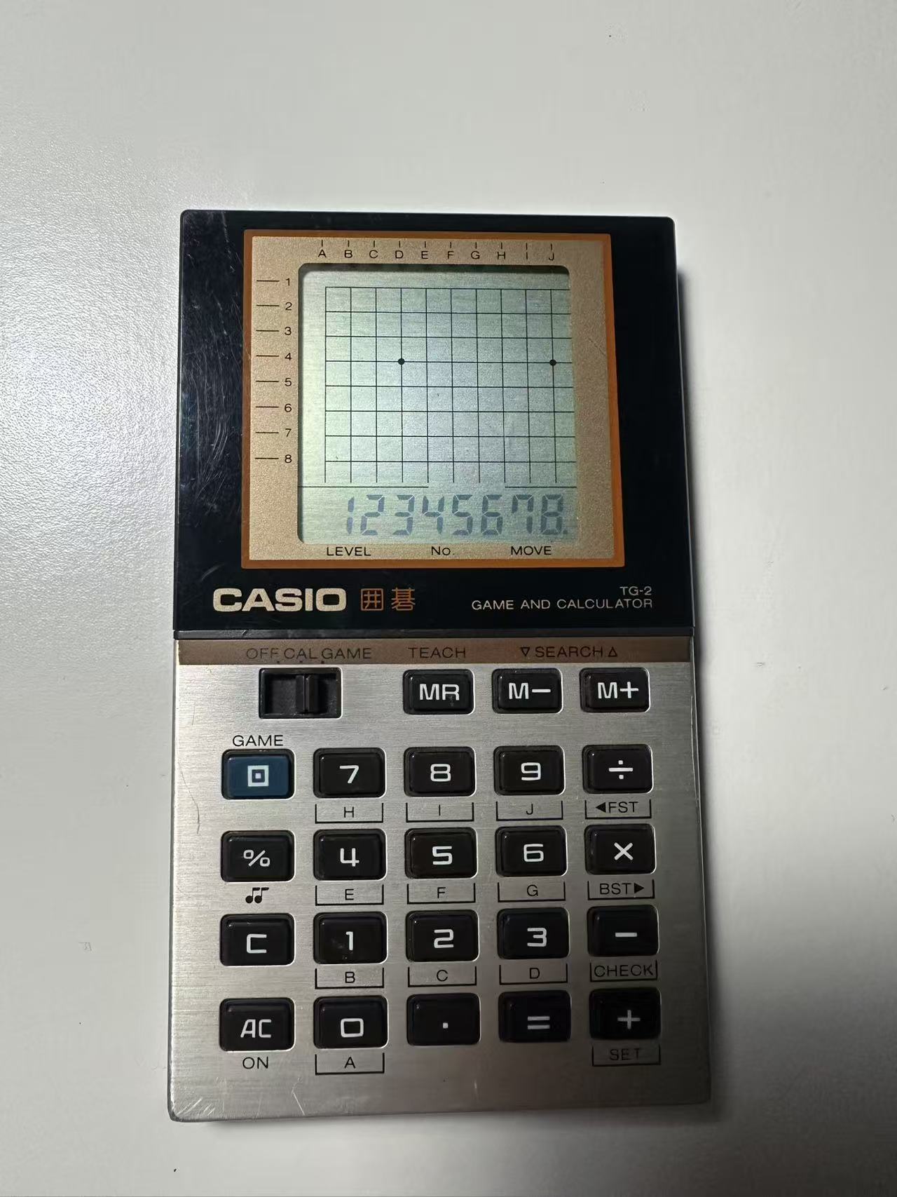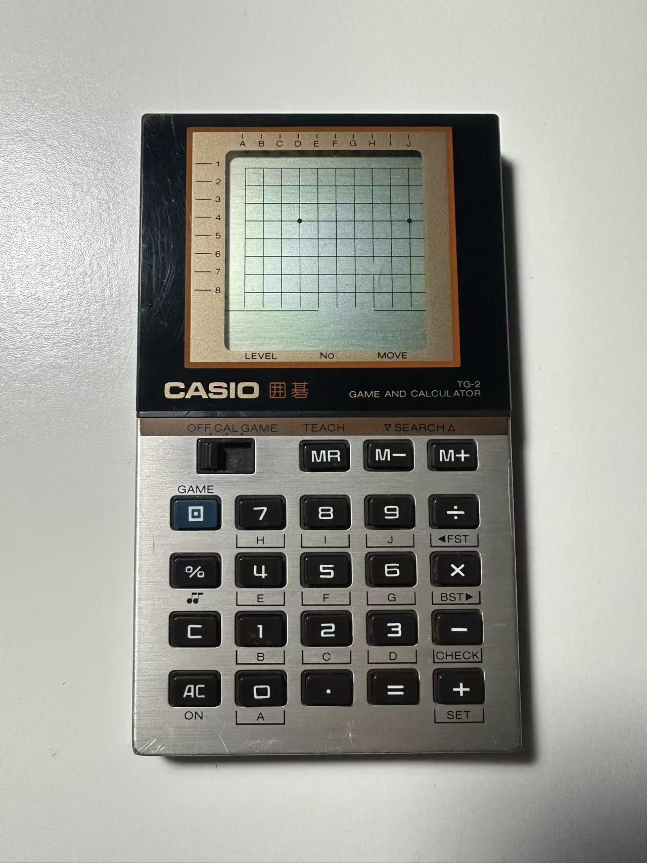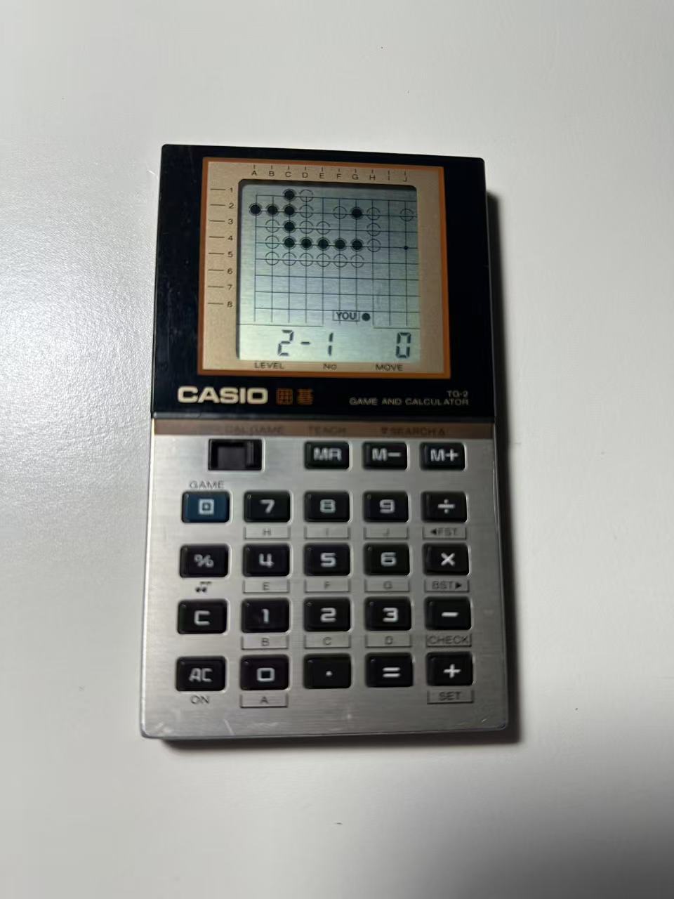 Casio TG-2 囲碁 Go 是卡西欧(Casio)公司于1984年推出的一款特色计算器,其核心亮点在于集成围棋手筋练习功能,是极为罕见的小众产品——目前网络上相关记载寥寥无几,堪称卡西欧计算器产品线中的“冷门珍品”。作为卡西欧唯一一款采用该特定造型的游戏计算器,它不仅具备基础计算功能,更专注于围棋训练场景,兼具娱乐与教学价值。
